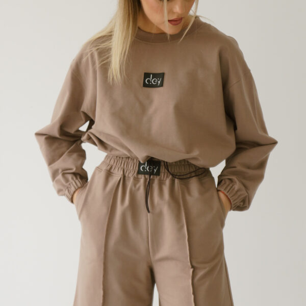 Džemperis trumpesnio modelio, padidintais pečiais, su išskirtinėmis detalėmis ties pečių siūle.